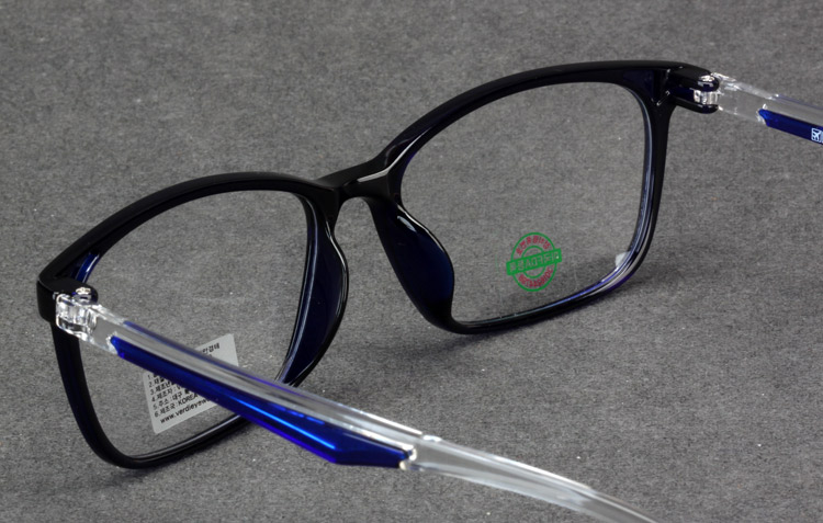 - Light TR frame with rectangular front and color bar inserted temples.