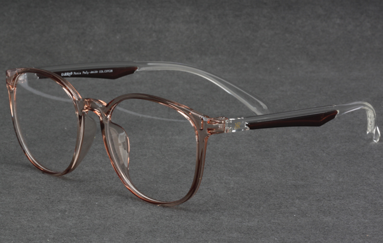 - Light TR frame with round front and color bar inserted temples.