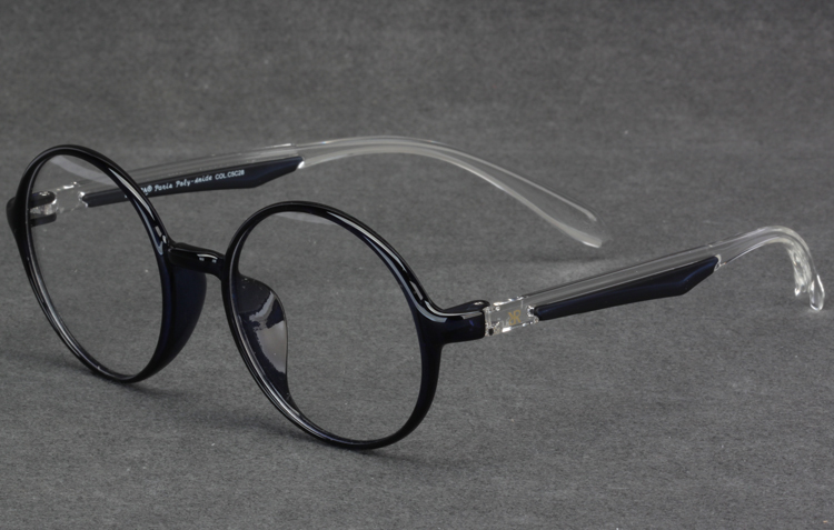 - Light TR frame with round front and color bar inserted temples.